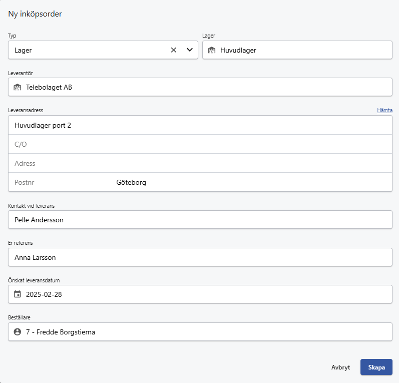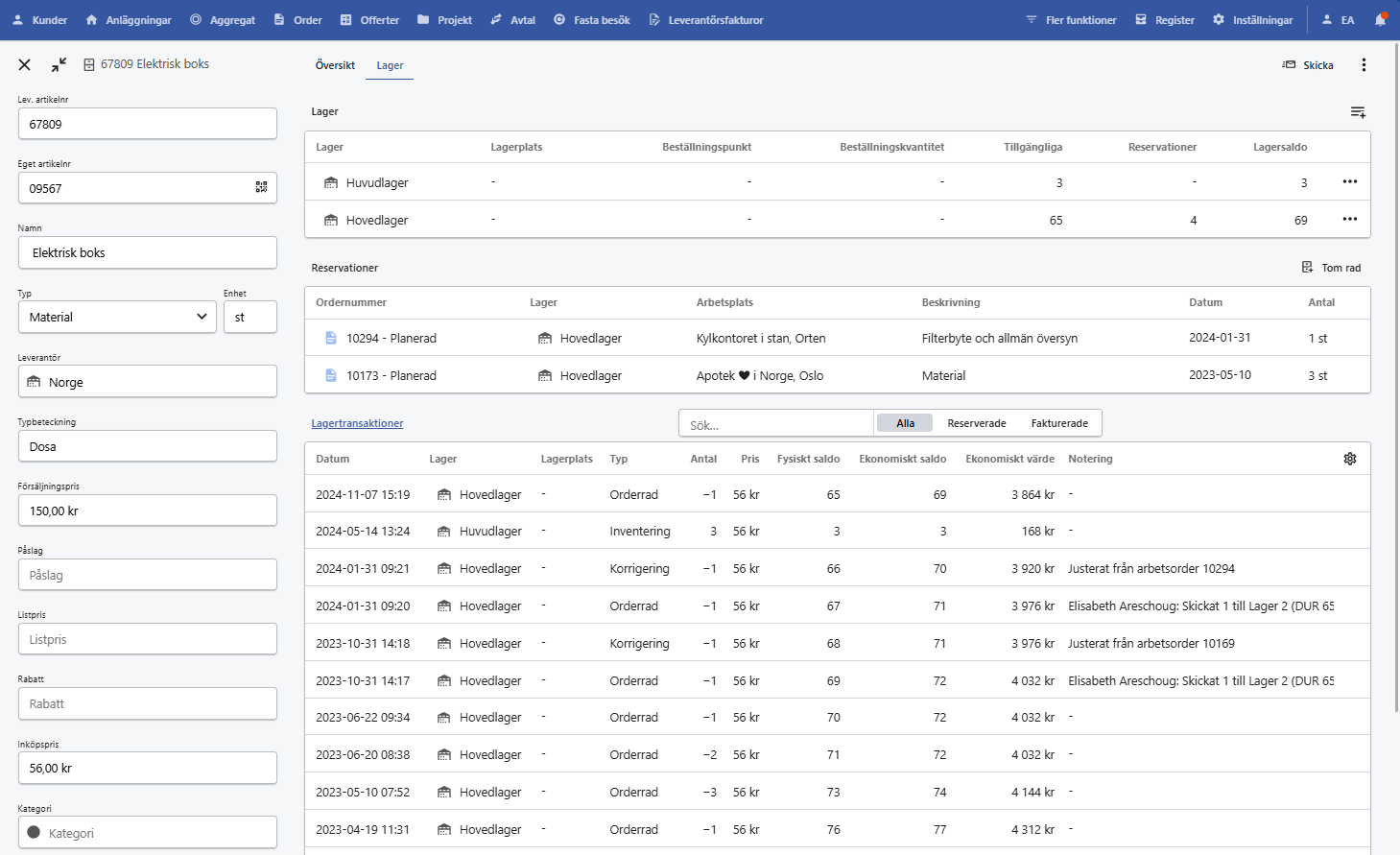 Innkjøp håndteres smidig direkte i lagermodulen. Opprett innkjøpsordre fra et prosjekt, en ordre eller direkte fra lageret. Systemet markerer automatisk artiklene som må etterfylles, for eksempel de som har nådd sitt bestillingspunkt, og foreslår riktig mengde i henhold til dine innstillinger.